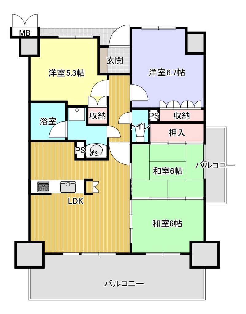 洋室6.7畳 洋室5.3畳 和室6畳 和室6畳 L13.8畳 |